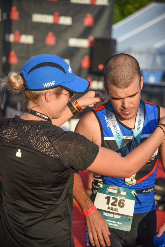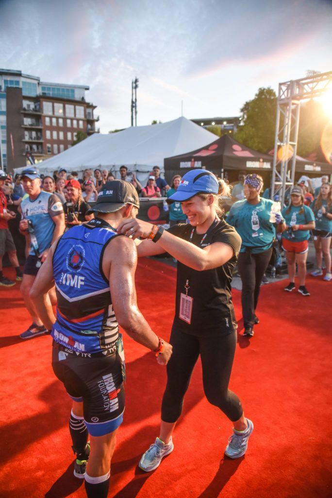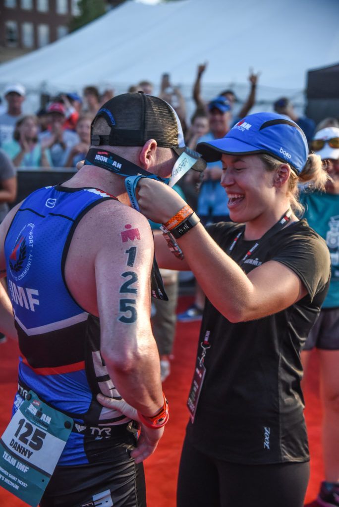 IRONMAN Foundation Program Coordinator, Morgan Liber, medals Danny as he dedicated his race to #RaceForMore (Image provided by: Tennessee Sports Pic’s)