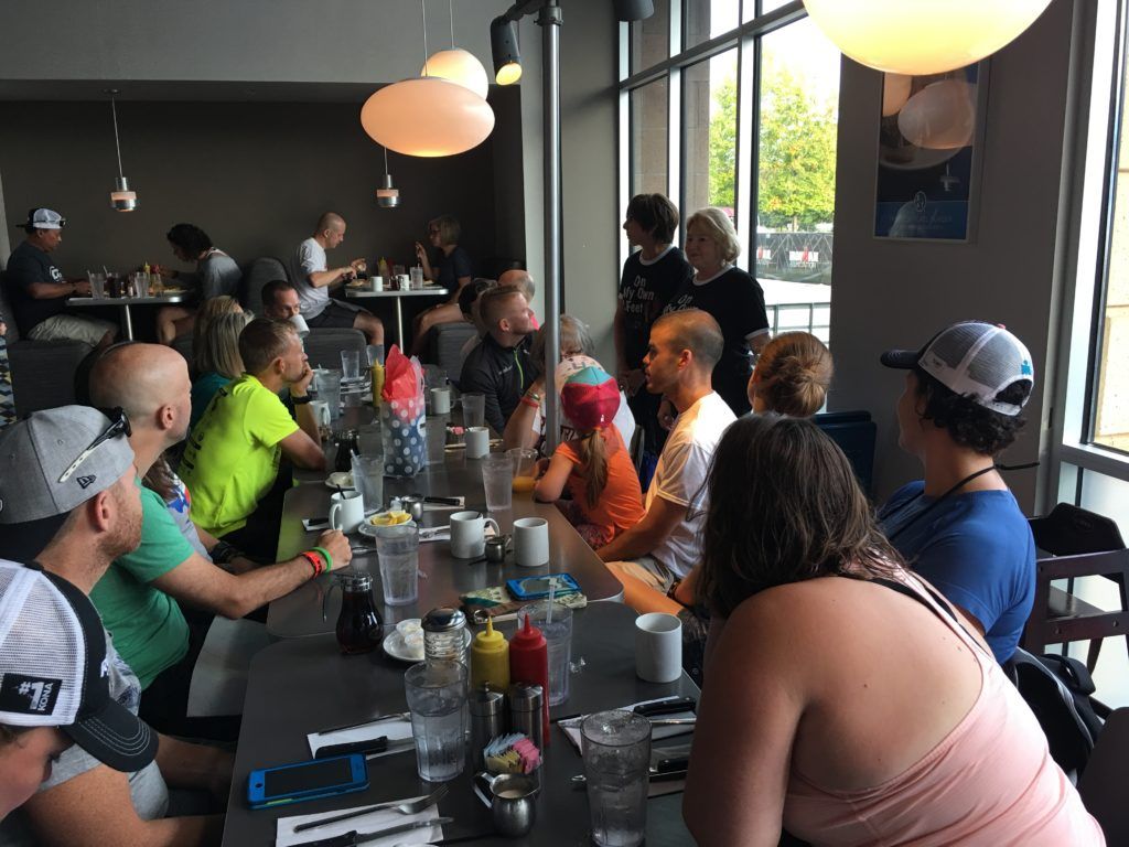 It was another hot and sunny weekend for our TEAM IMF Athletes’ who toed the start line for IRONMAN Chattanooga 2017 in hopes of setting new PR’s thanks to the generous current of the Tennessee River along the city’s famous Riverwalk. Prior to the start line, 9 TEAM IMF teammates came together for our breakfast at The Blue Plate on Saturday morning, where not only did the “Voice of IRONMAN”, Mike Reilly made an appearance, but as did one of the IRONMAN Foundation Community Grant recipients “On My Own 2 Feet”—a non-profit whose mission is to channel the commitment and discipline received in training runs to other life activities such as obtaining independence, a job and ultimately housing for the homeless community in Chattanooga. “On My Own 2 Feet” personally thanked our TEAM IMF Athletes for their fundraising efforts and for not only making an impact on their own organization, but for leaving their legacy on the IRONMAN Chattanooga community long after race day regardless of their race results.