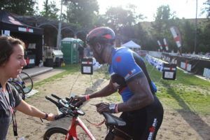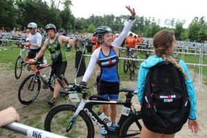 TEAM IMF Athlete, Aly Jacobs, waving to her family in T1.