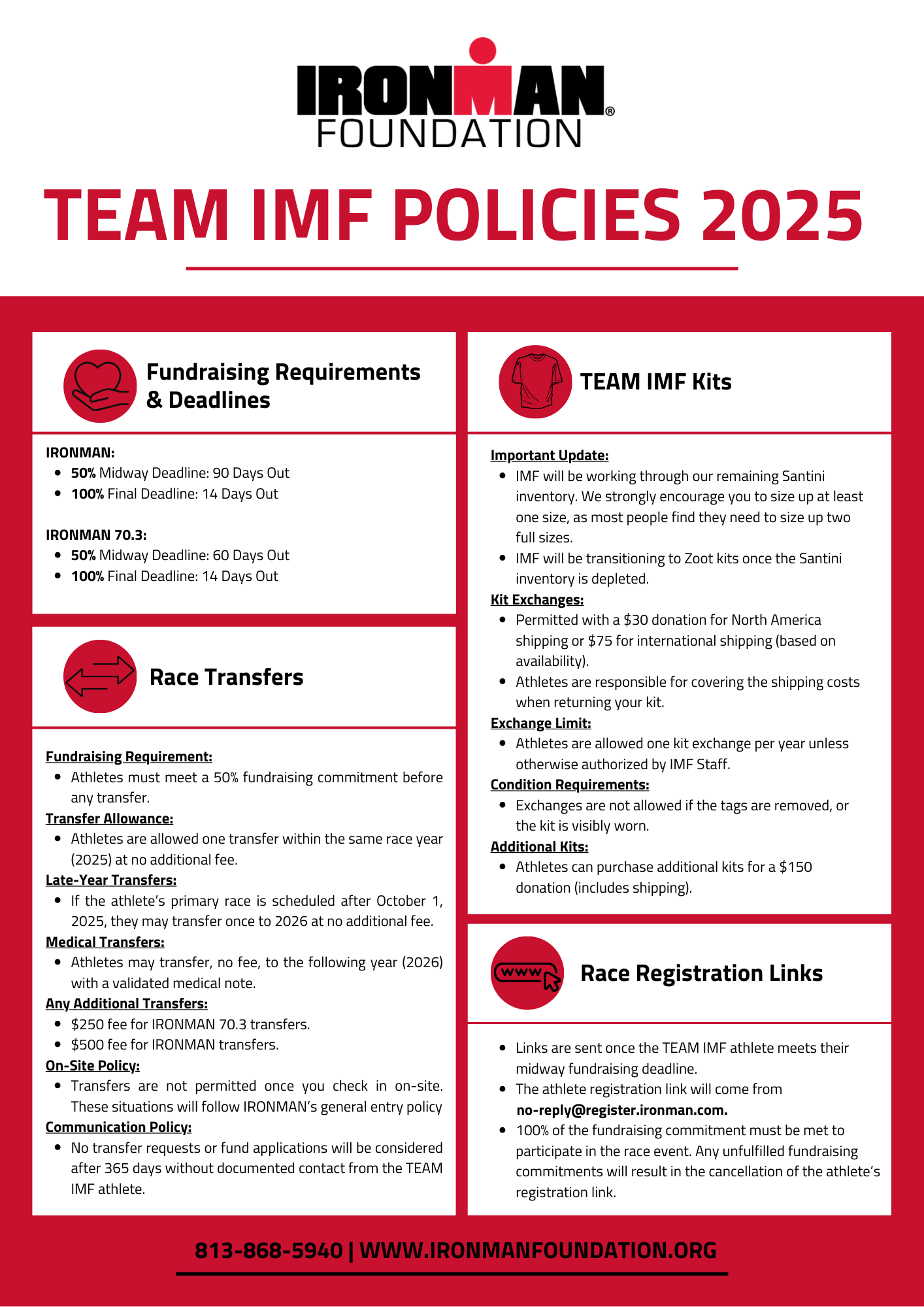 - (If you are a TEAM IMF Alum, or already have a race entry, please email athletesupport@ironmanfoundation.org to get your discounted fundraising code!)